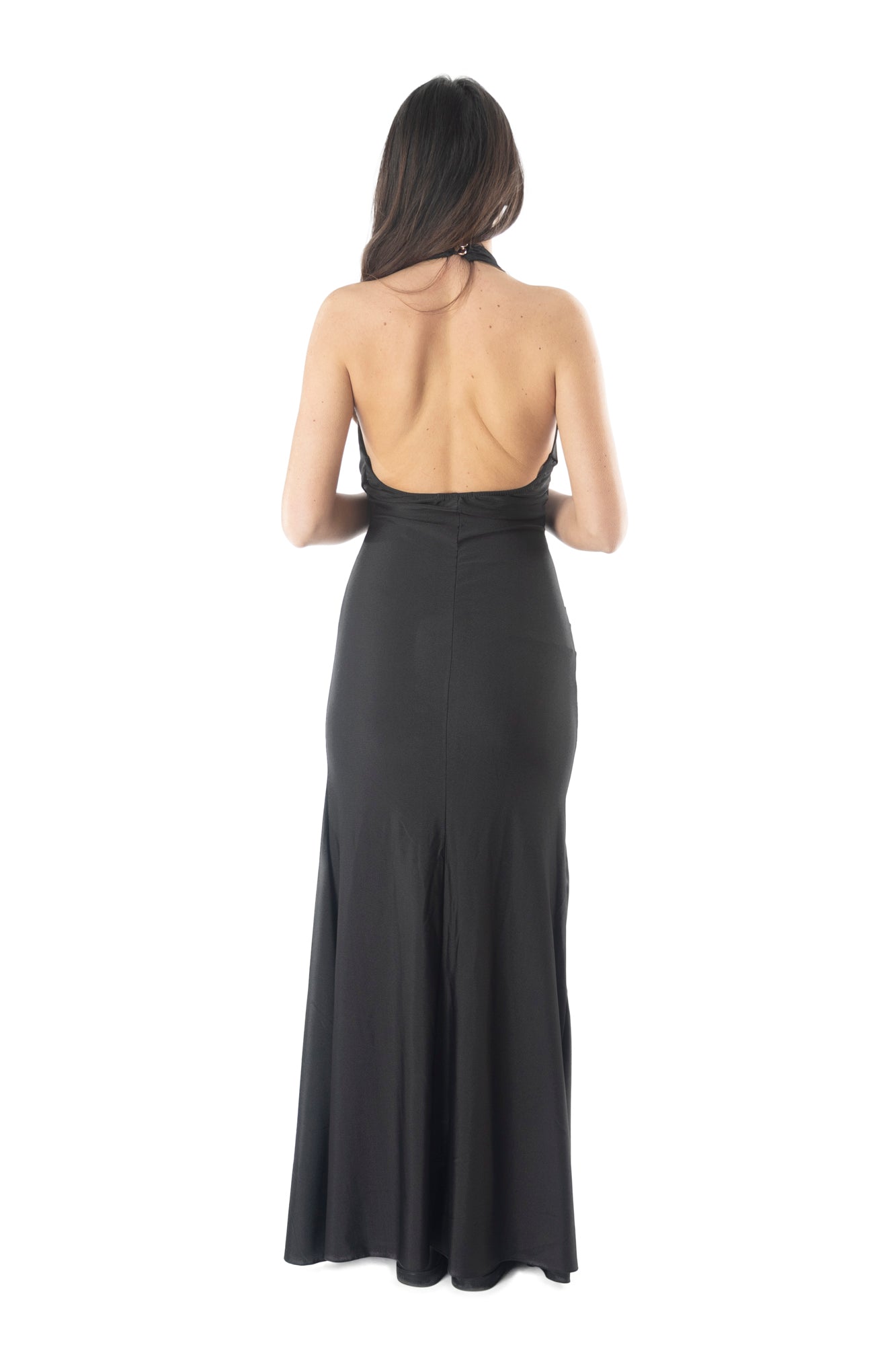 Vestito lungo nero dal design elegante e sofisticato, con schiena coperta per un look raffinato e senza tempo. La linea femminile valorizza la silhouette con classe, rendendolo perfetto per cerimonie, eventi serali e occasioni speciali. Un capo chic e versatile, ideale per chi ama uno stile ricercato e impeccabile.